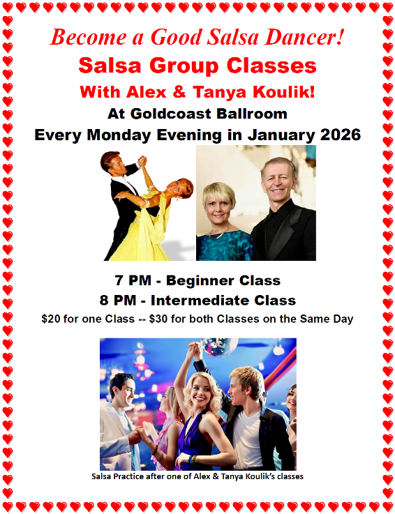 New! - Every Monday Evening in January 2026 - Salsa Group Classes with Alex & Tanya Koulik! - 7 PM Beginner - 8 PM Intermediate - $20 for one Class - $30 for both Classes on the Same Day